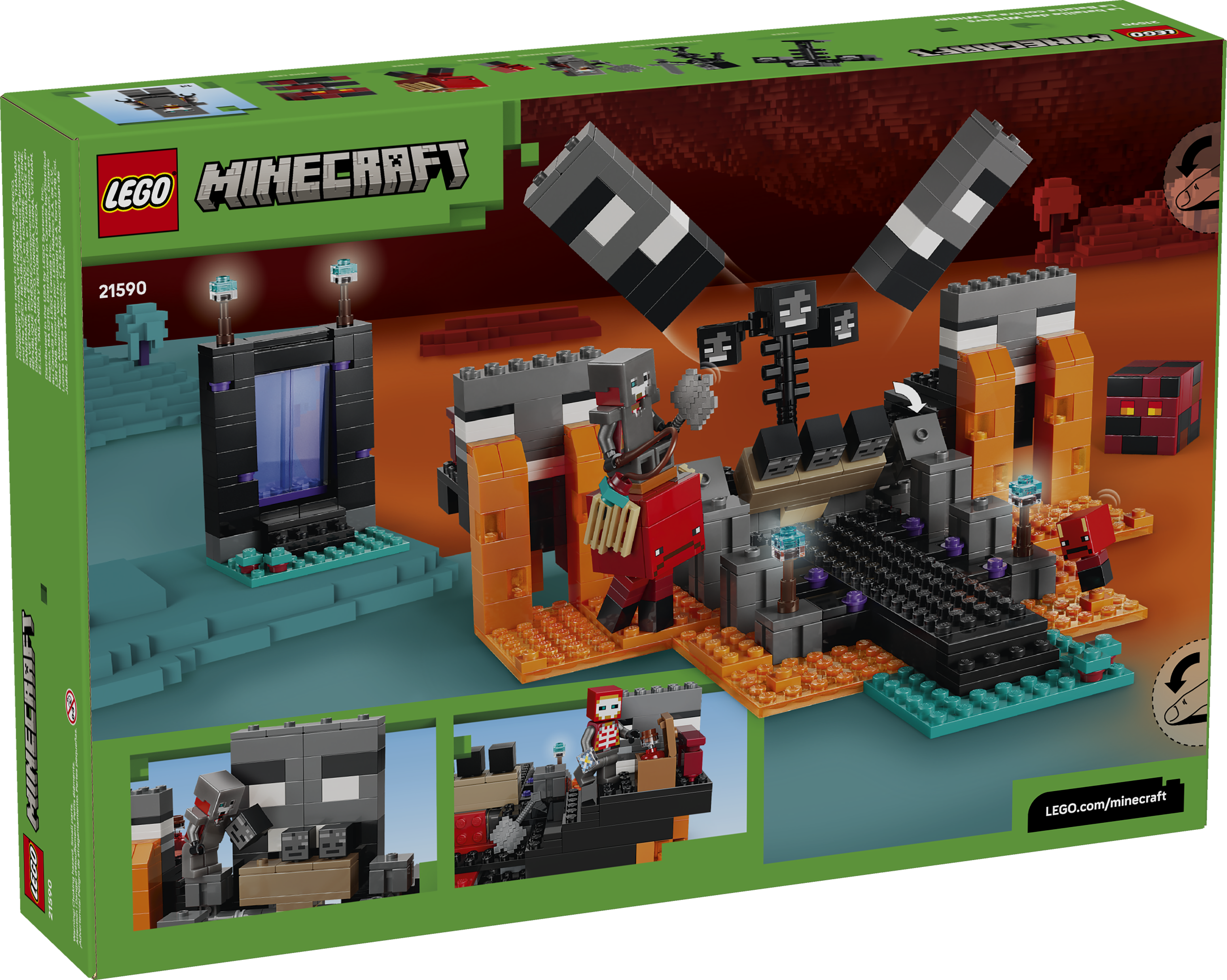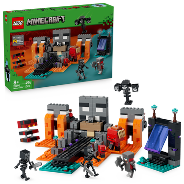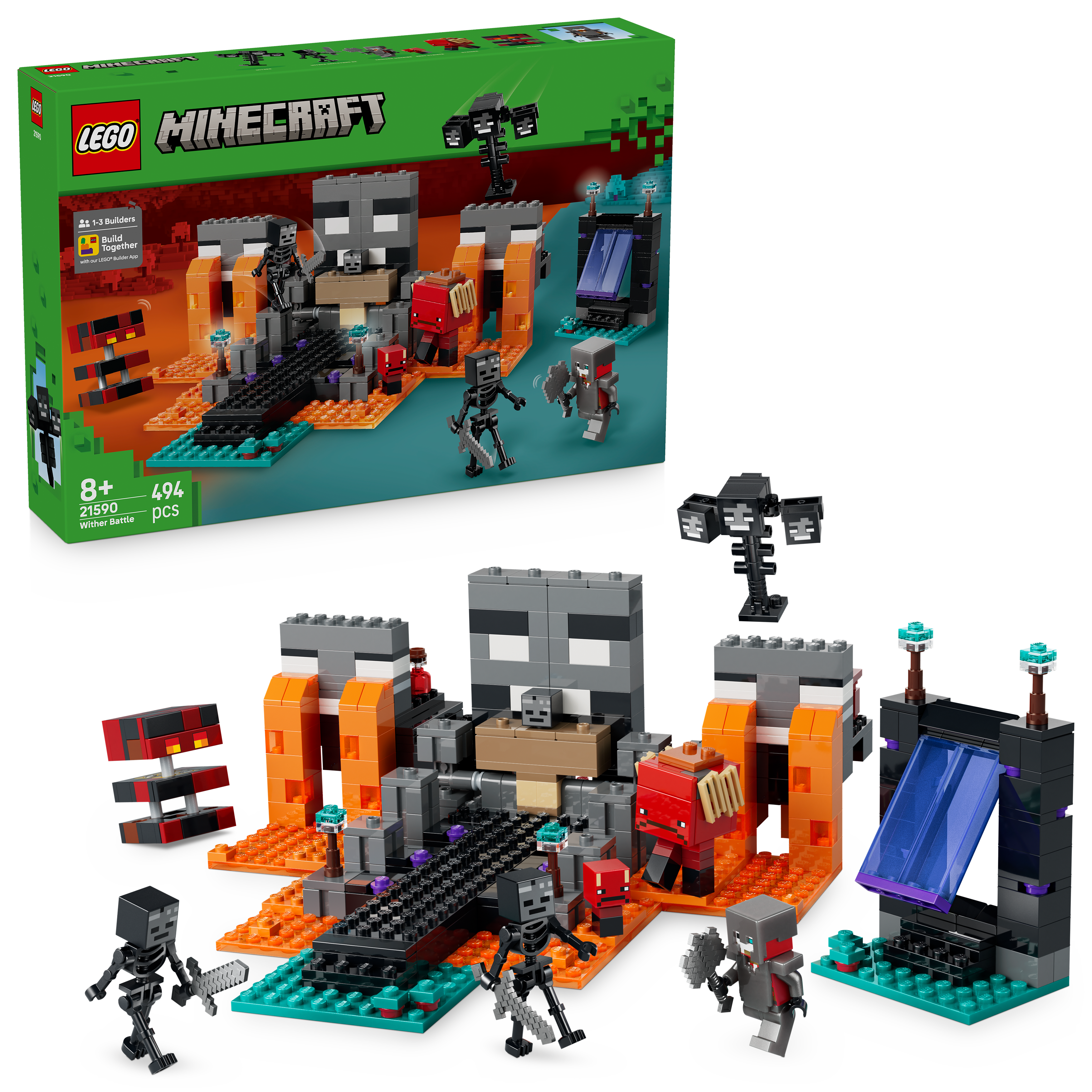 - 7 MINECRAFT® CHARACTERS – Join a Crimson Warrior and 2 wither skeleton mob figures, plus a strider, baby strider, wither and magma cube mob figures, in the LEGO® Minecraft® Wither Battle (21590)
