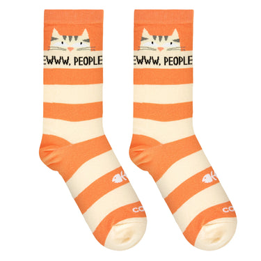 These Eww People Cats crew socks are perfect for the person who absolutely despises people and prefers the company of four-legged furry kittens. These orange and cream striped socks feature a graphic knitted image of a kitten peeking up at the cuff. Each pair of socks is designed with a 100% premium cotton blend with a double padded bottom for extra cushion, complete with an extended cuff to prevent sliding.