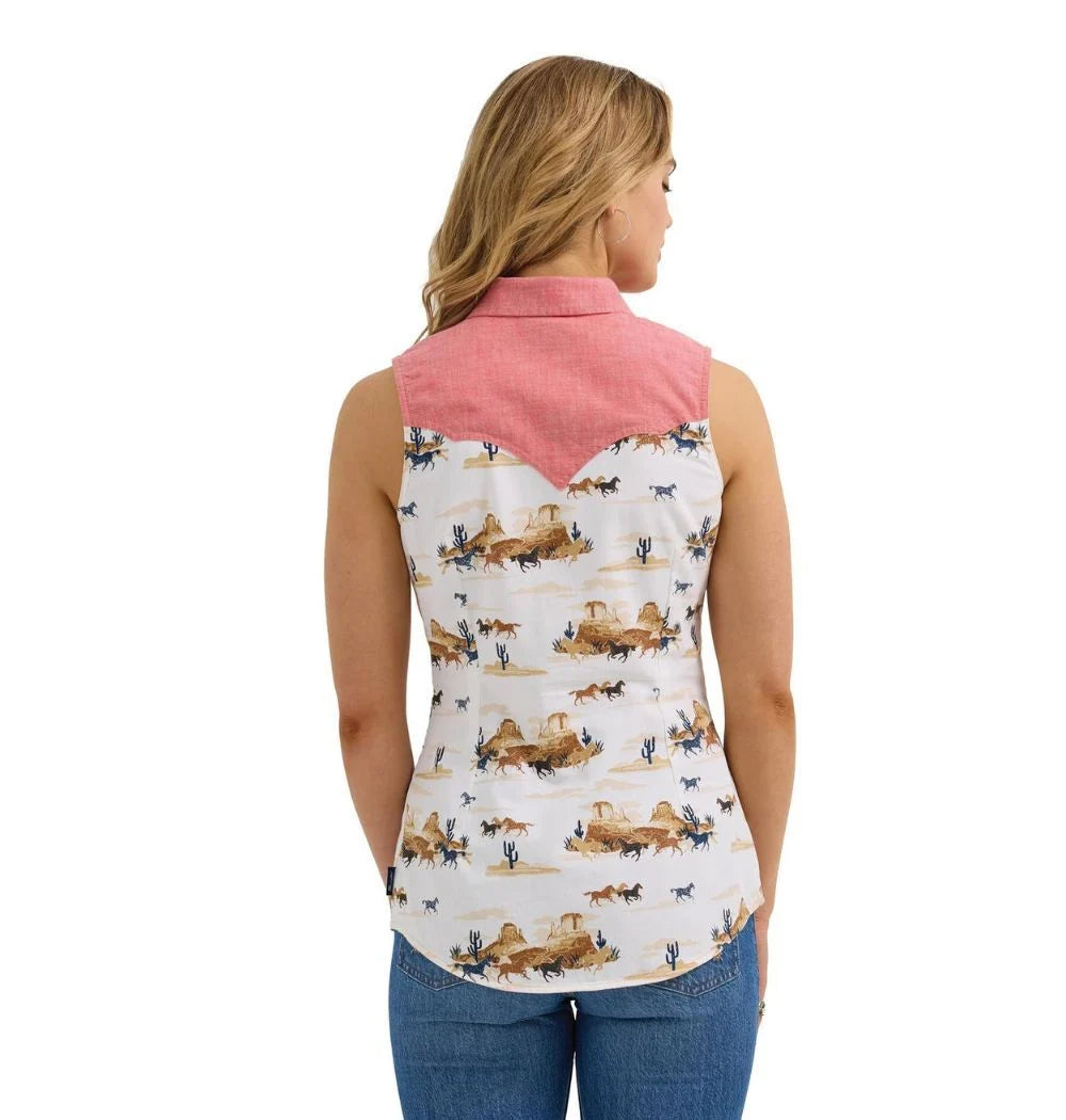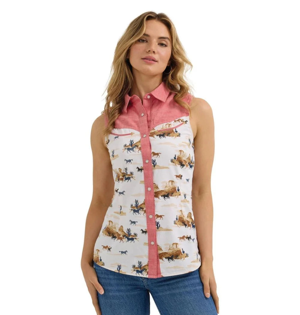 Wrangler Desert Print Sleeveless Snap Shirt adds fresh charm to Western design for a fashionable yet authentic look. Women's Western snap shirt for summer has a distinctive print of horses and desert scenery in shades of brown and black. The print is balanced with solid pink Western yokes.