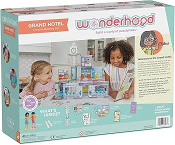 Kids can create the hotel of their dreams and endless other designs with this deluxe building set, featuring a working elevator! Beautifully illustrated scenes on double-sided, glossy plastic panels can be rearranged into all sorts of imaginative combinations: just clip them together with the durable plastic connectors. Each Wonderhood set comes with an Activity Journal filled with stories and fun architectural challenges kids can take on to put their problem-solving skills to the test! Add the Grand Hotel to other Wonderhood sets to create a whole city!• Creative and re-designable play-house set develops fine motor skills and self-confidence• Activity Journal challenges encourage development of S.T.E.A.M. skills and spatial reasoning• Introduces concepts of architectural design and structural engineering• All Wonderhood toys are compatible; collect them all to add to the fun!• Includes 64 pieces: washable plastic building panels, easy-clip connectors, moveable parts, decorative reusable stickers and 2 figurines, plus S.T.E.A.M. powered building challenges