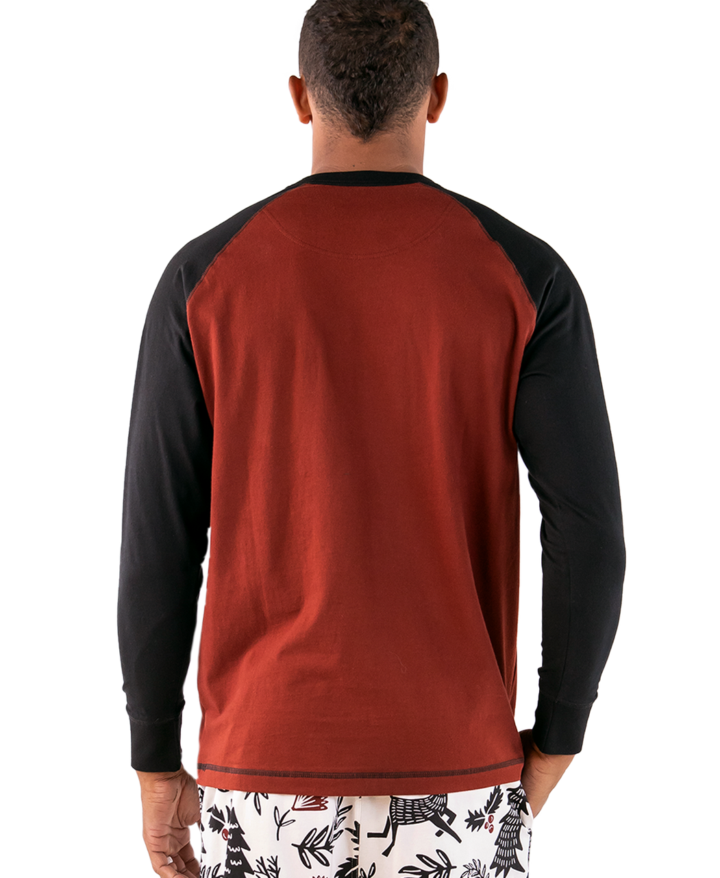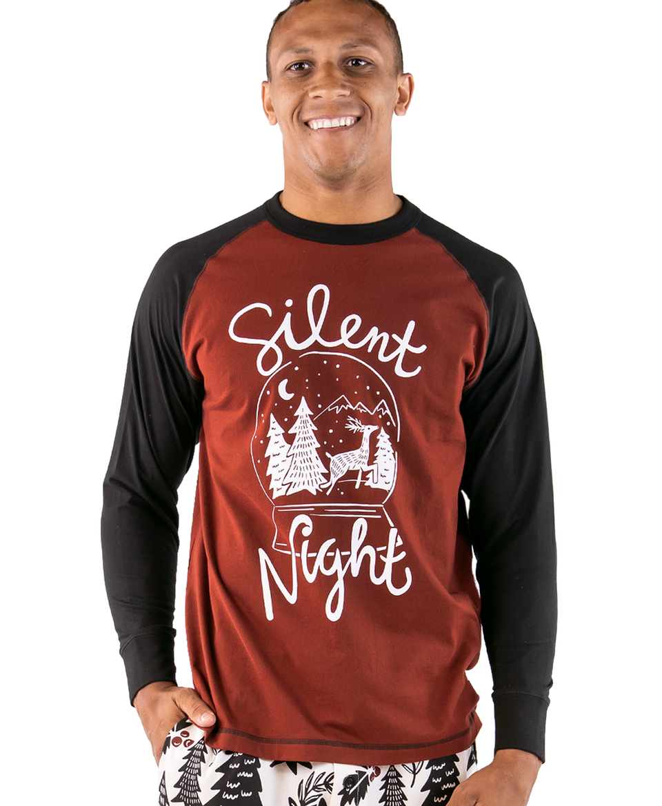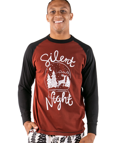 Our Silent Night men's long sleeve pajama tee features a fun and festive design perfect for family matching Christmas pajama photos. This roomy men's pj tee is dark red with black raglan sleeves, and their thinner fabric makes this tee great to sleep in. Matching pj pants can be purchased separately.