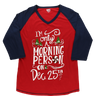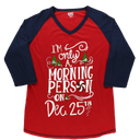 Wake up comfortable on Christmas with our Candy Cane Women's Tall Tee. This tee features the fun saying I'm Only a Morning Person On Dec. 25th, making it perfect for the holiday season. Our long, coordinating t-shirt is made of lightweight cotton and sports a flattering cut with a rounded bottom hem, V-neck, and three-quarter sleeves.