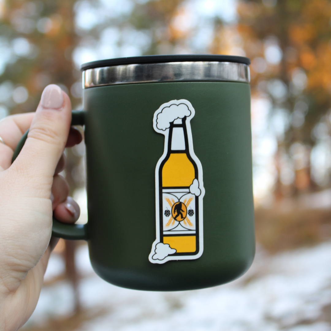 Pop a cold one with your forest friends in Bigfoot's honor with this bubbly brew sticker! The sudsy yellow beer bottle features a label including graphics of Sasquatch, barley, and hops. 1"-by-3"